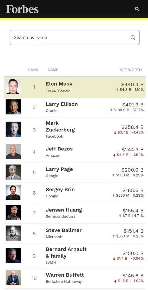 榜单显示,特斯拉首席执行官、太空探索技术公司(SpaceX)创始人埃隆·马斯克的最新财富为4404亿美元,依然是全球首富。