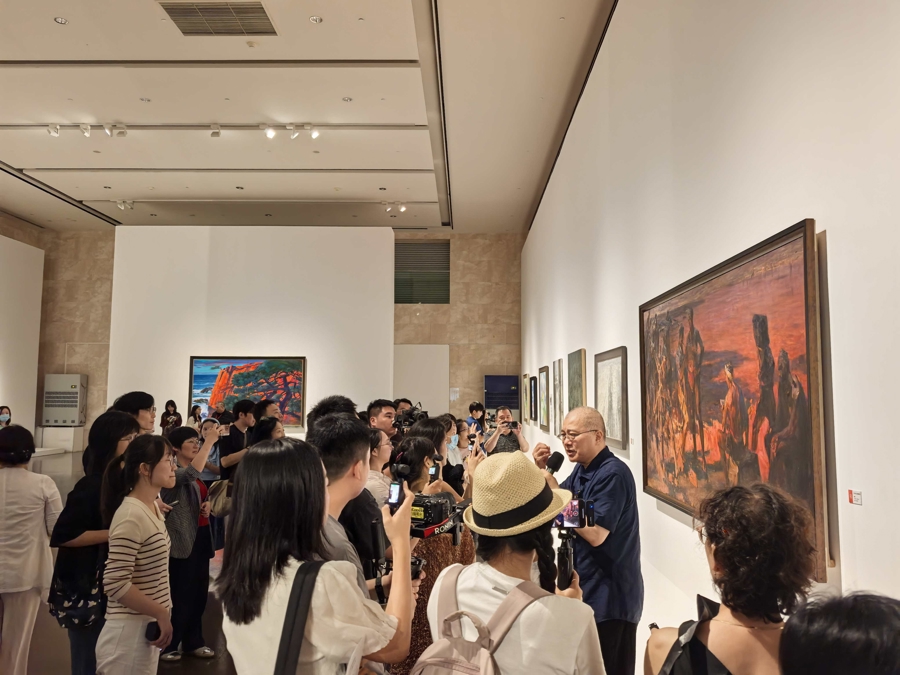 已故油画大家詹建俊高1.8米、宽3米的油画《听涛-红霞》被陈列在展厅最为显眼的位置,像是为“巍巍者华”四字作出的荡气回肠的图注。詹建俊将传统山水的写意精神融入画面,用油画语言画出了中国气魄,他用刮刀堆砌出肌理的厚重感,既保留了油画材质的质感,又暗合中国山水画“皴擦”技法的韵律。只见画面中浪涛裹挟着白色泡沫,如凝固的雕塑般呈现出爆发前的张力,既具物理真实感,又成为生命力量的象征。这幅作品詹建俊创作于2013年,不仅是他个人创作的新高峰,也为当代油画的民族化探索提供了重要启示——真正的艺术,永远是“以心观物,以物载道”的生命之歌。